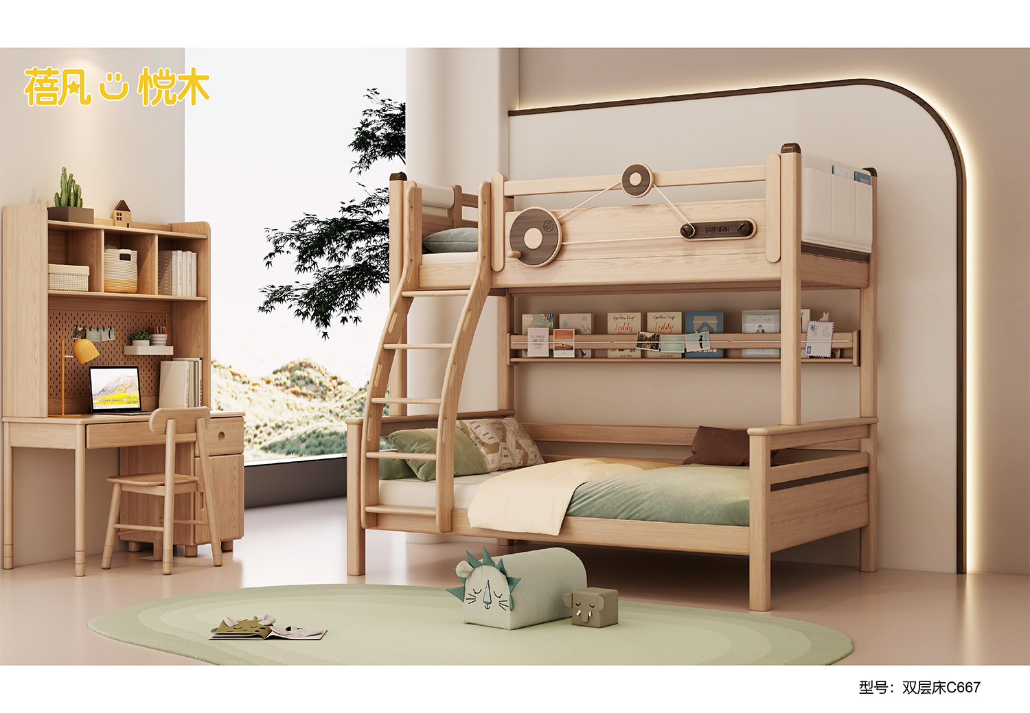 蓓凡悦木系列以自然、童趣与生活美学为核心,打造充满想象力的儿童成长空间,涵盖单床、双层床、高架床、书柜床等多元品类,搭配书桌、衣柜、收纳柜及秋千、滑梯等配套单品,满足睡眠、学习、玩乐、收纳全场景需求。