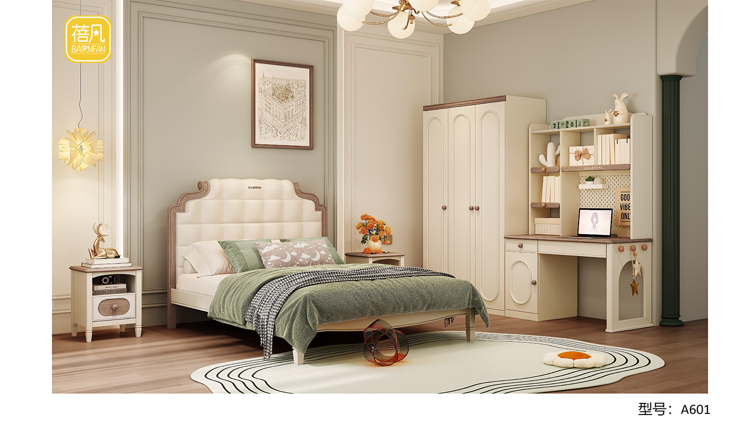 蓓凡轻法系列儿童家具,以天然白蜡木与温润桃花芯木为核心双实木材质,搭配环保水性漆,无异味更安全,边角全柔化处理,适配儿童日常使用需求。系列涵盖城堡床、套房、双层床、书柜床等多元品类,精准匹配不同家庭场景。