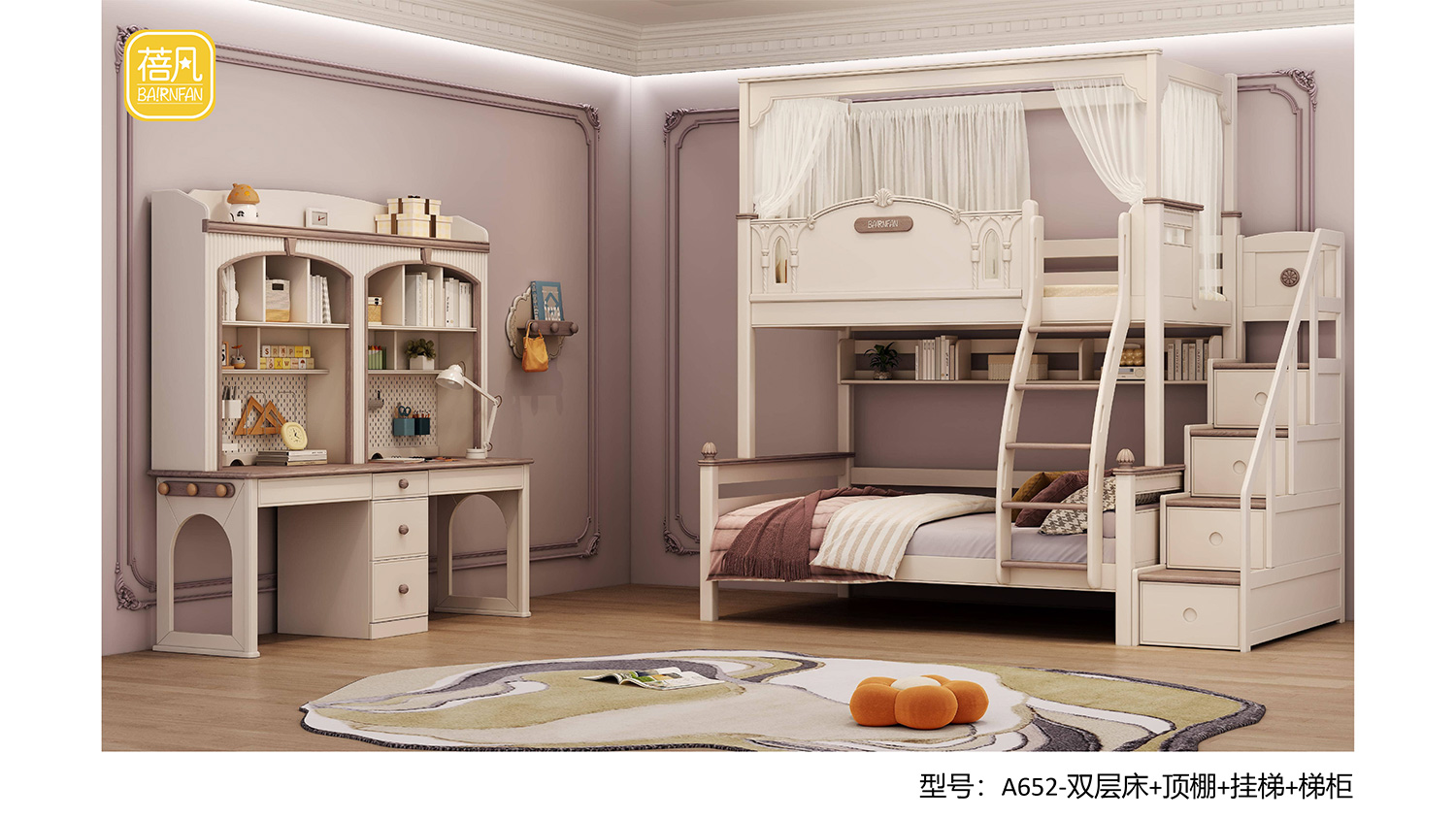 蓓凡轻法系列儿童家具,以天然白蜡木与温润桃花芯木为核心双实木材质,搭配环保水性漆,无异味更安全,边角全柔化处理,适配儿童日常使用需求。系列涵盖城堡床、套房、双层床、书柜床等多元品类,精准匹配不同家庭场景。