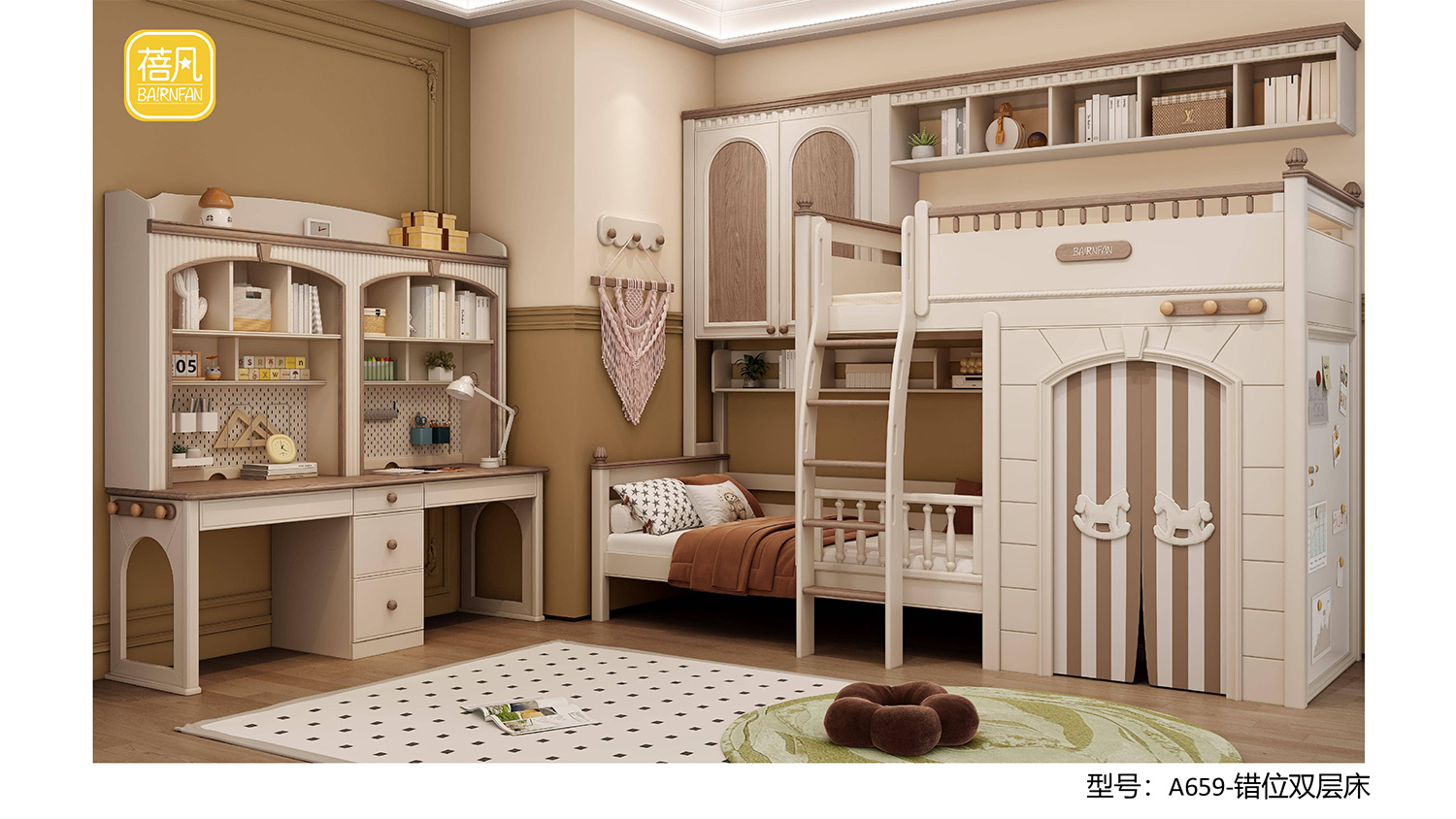 蓓凡轻法系列儿童家具,以天然白蜡木与温润桃花芯木为核心双实木材质,搭配环保水性漆,无异味更安全,边角全柔化处理,适配儿童日常使用需求。系列涵盖城堡床、套房、双层床、书柜床等多元品类,精准匹配不同家庭场景。